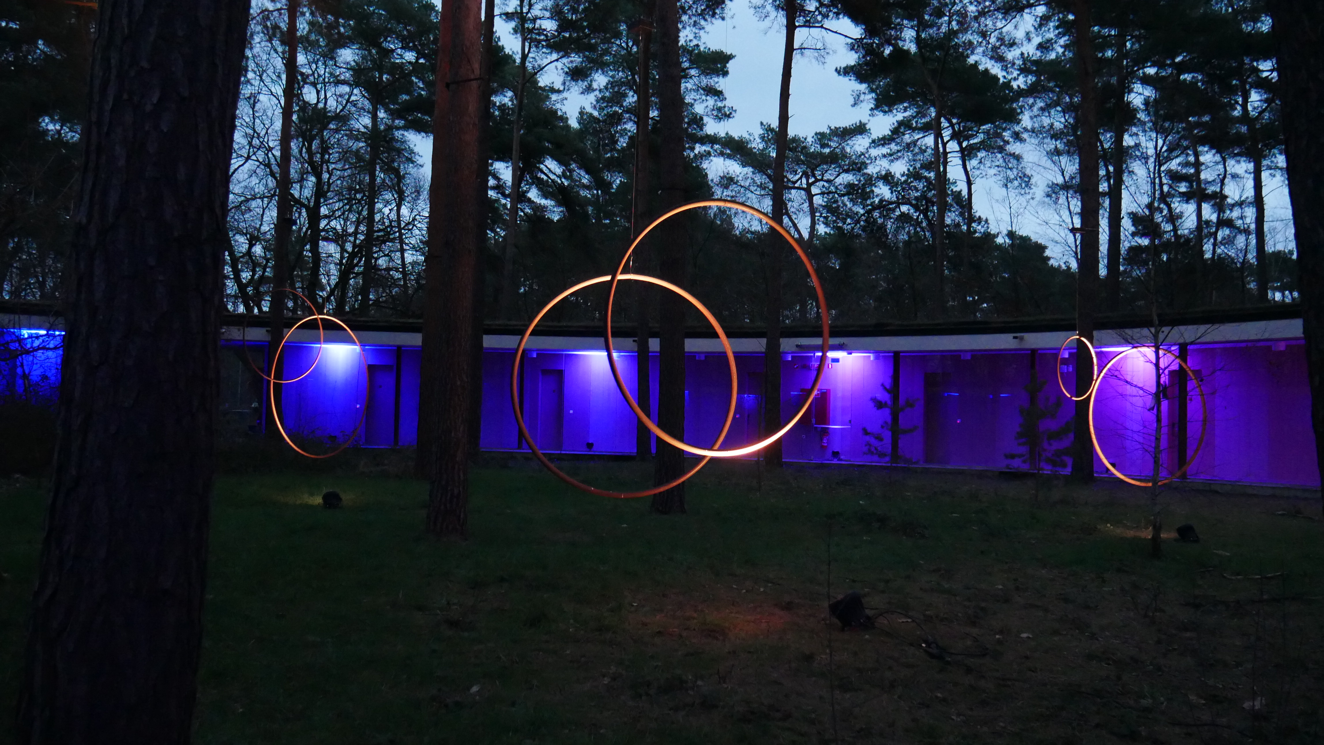 Bling rrrring extended is a kinetic installation installed in a forest during the festival Out of the Dark. The metal rings sound an alliatorial, microtonal composition, produced by detimed and undetimed rotational movements and the resulting collisions.